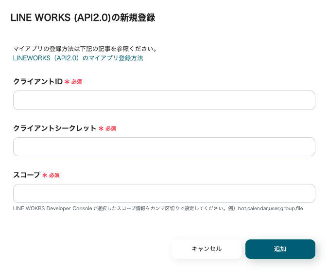 LINE WORKSのDeveloper Consoleから取得した情報を各項目に入力し、追加ボタンをクリックします。