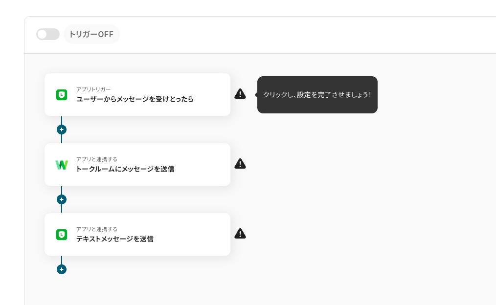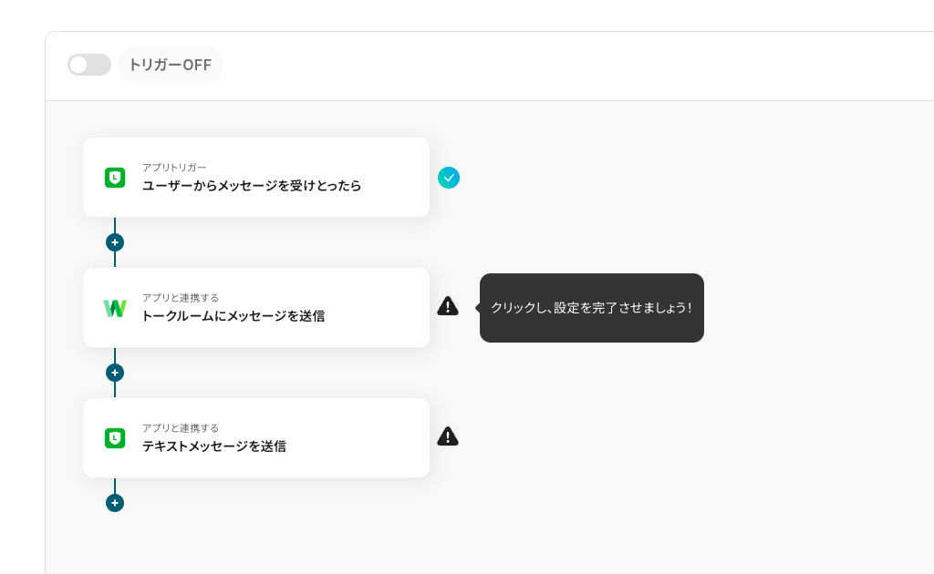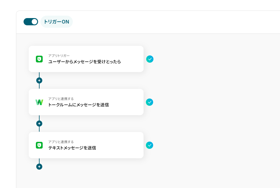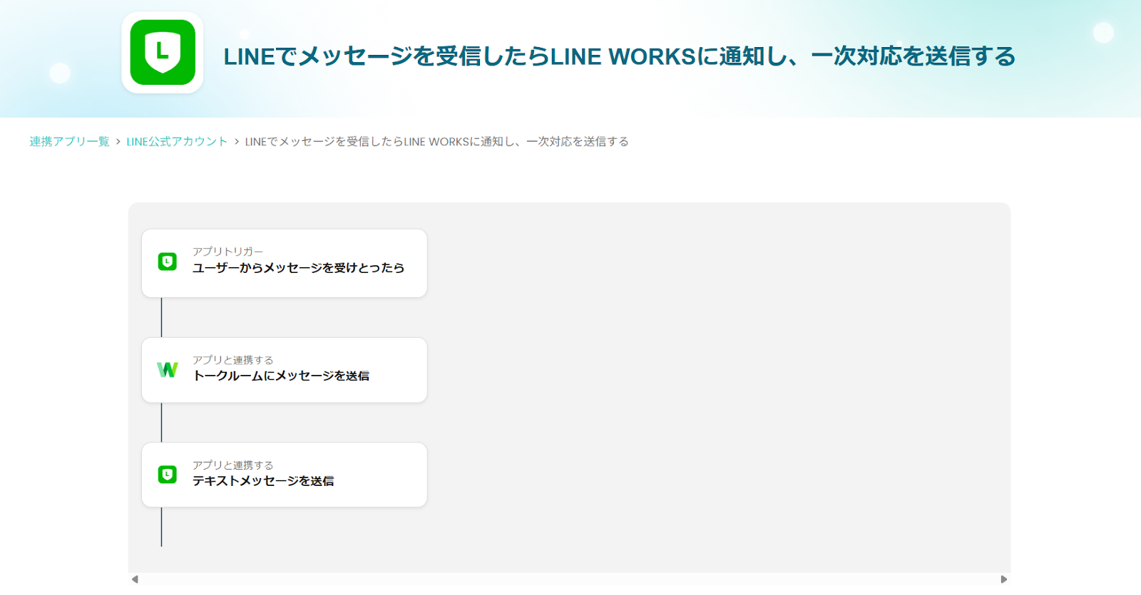 このワークフローを活用すれば、LINEで受信したメッセージをLINE WORKSに自動で通知し、一次対応メッセージを自動送信することで、対応のスピードと精度を向上させることができます。