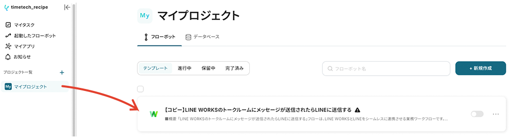 コピーしたテンプレートは、マイプロジェクトに追加されます。マイプロジェクトは左のメニューバーからアクセス可能です。