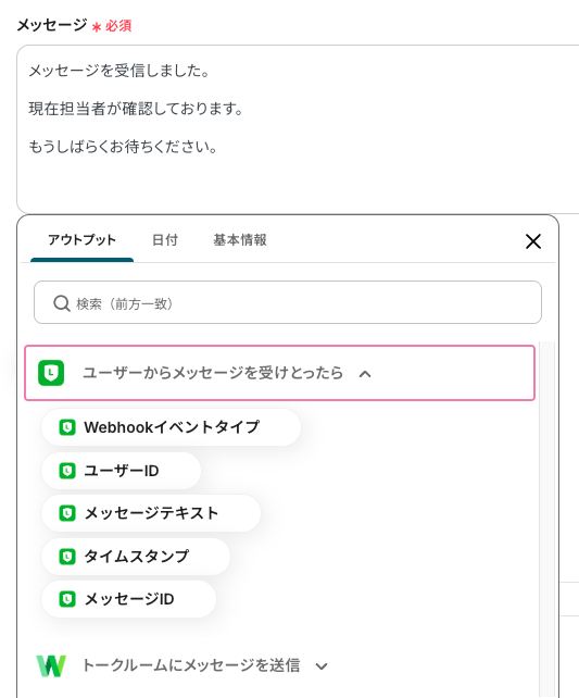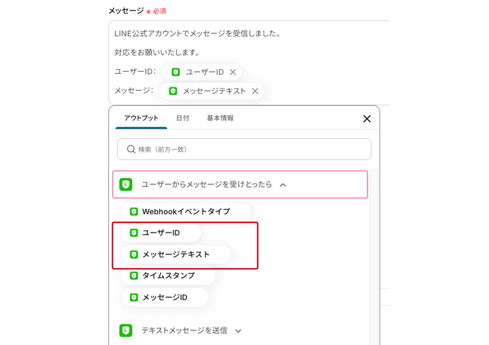 - 事前設定で、ユーザーIDやメッセージテキストの引用コードが埋め込まれています。これは、前の操作で取得したアウトプットの動的コードです。このコードは編集欄をクリックすると表示されるプルダウンメニュー内にあります。
