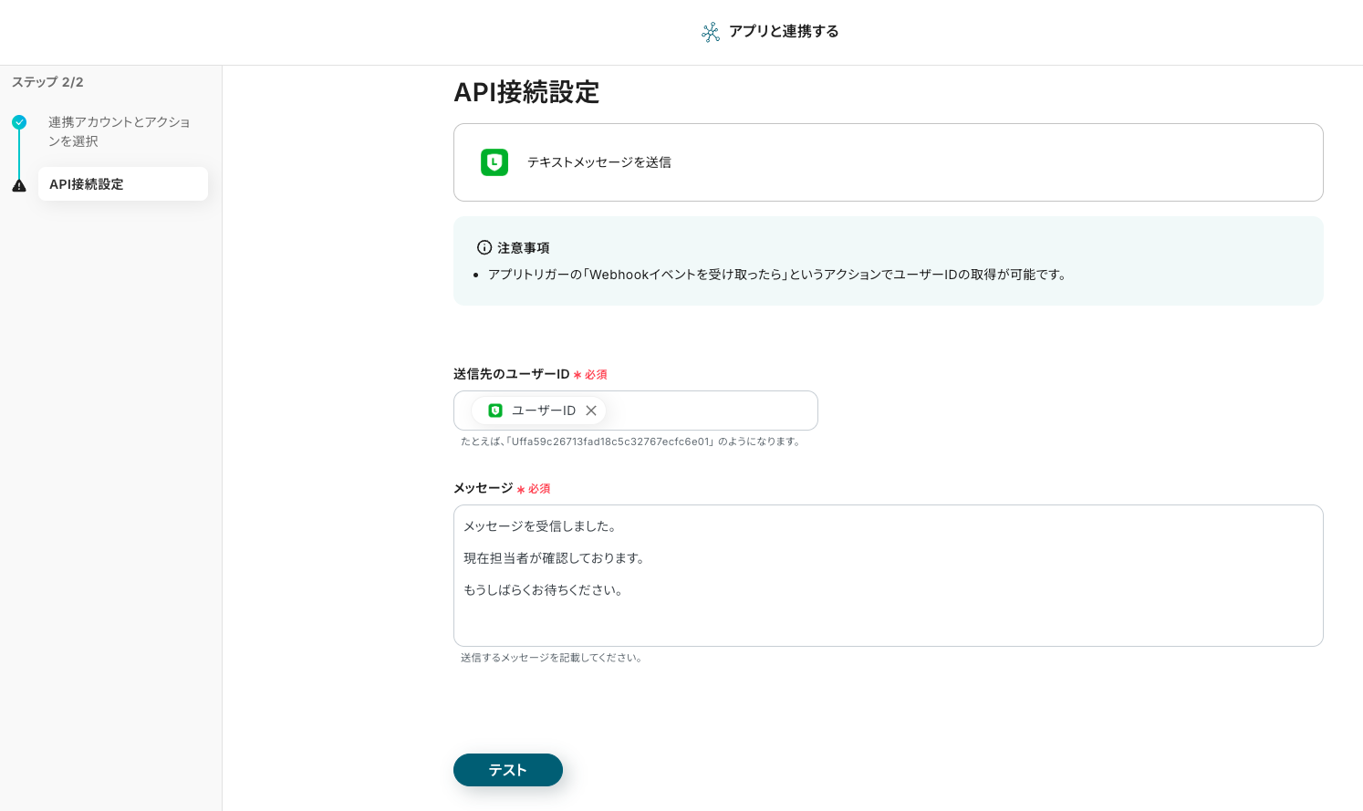 入力が終わったらテストボタンをクリックします。成功すると、LINE公式アカウントからメッセージが送信されます。