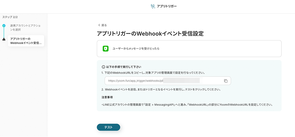 この画面ではWebhookURLを取得します。LINE公式アカウントのLINE Developersコンソールで、このURLを設定すると、LINE公式アカウントのチャットの検知が可能になります。