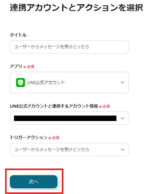 「トリガーアクション」→ユーザーからメッセージを受けとったら