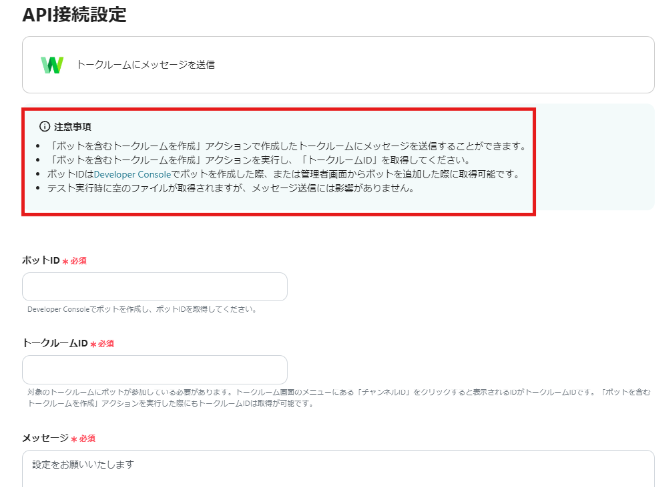 ・ボットID:事前に設定しているボットIDをLINE WORKSから取得し、入力します。