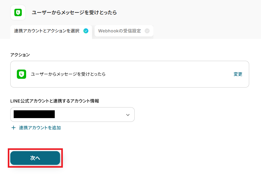 - 次に、トリガーでLINE公式アカウントを選択し、「Webhookイベントを受けとったら」というアクションを設定します