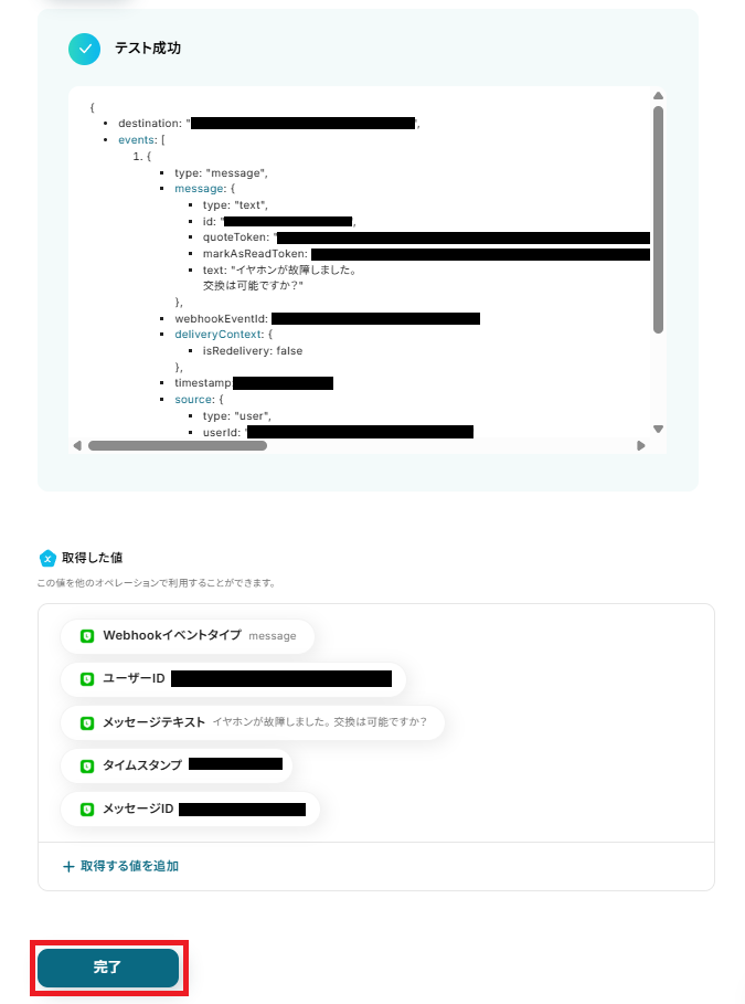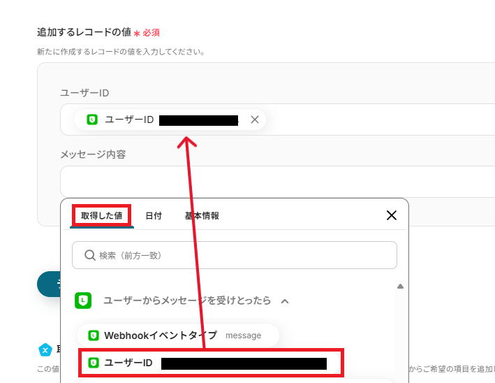 本文以外には、「Webhookイベントタイプ」「ユーザーID」「タイムスタンプ」「メッセージID」といった情報を取得でき、自動で記録することができます。
