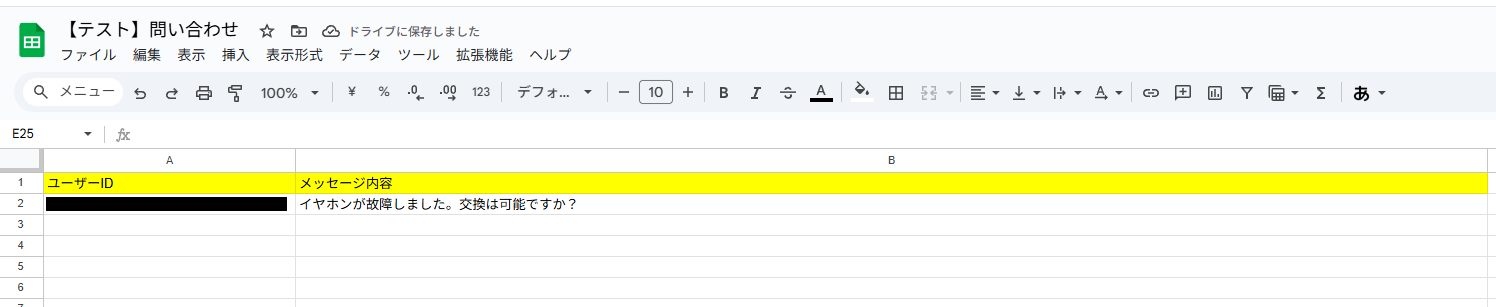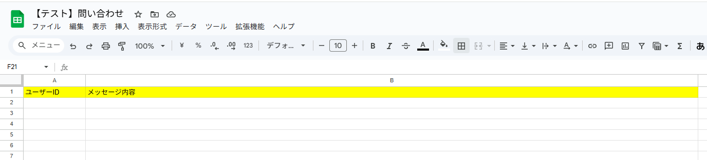 まずは、メッセージを記録するシートを作成しておきましょう。今回は以下のようなスプレッドシートを作成しました。