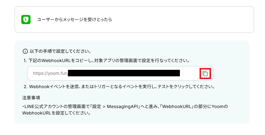 次の画面でWebhookURLをコピーし、対象アプリの管理画面で設定を行う必要があります。