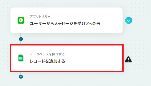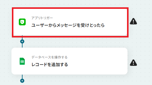 - 最後に、オペレーションでGoogle スプレッドシートの「レコードを追加する」アクションを設定し、トリガーで受信したメッセージ内容などを指定のシートに追加します。