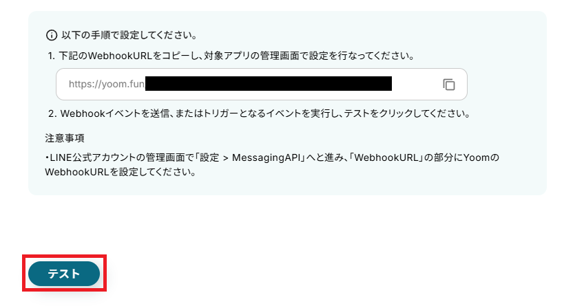実行したらYoomに戻り「テスト」をクリックしてください。