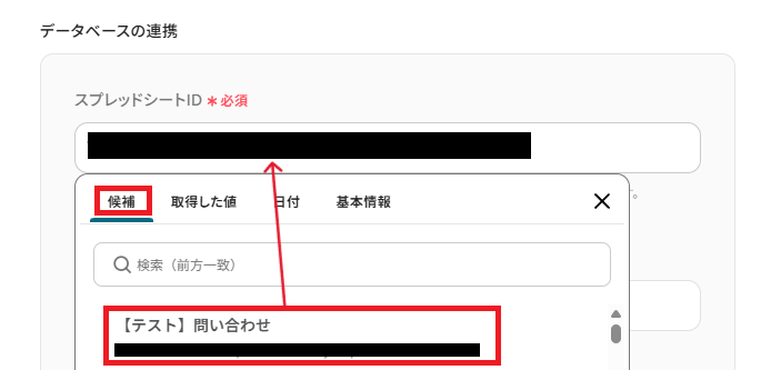 「スプレッドシートID」と「スプレッドシートのタブ名」は、【候補】から先ほど作成したシートを選択してください。