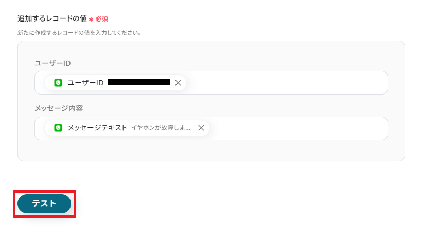 「追加するレコードの値」を、取得した値を引用してそれぞれ設定していきます。