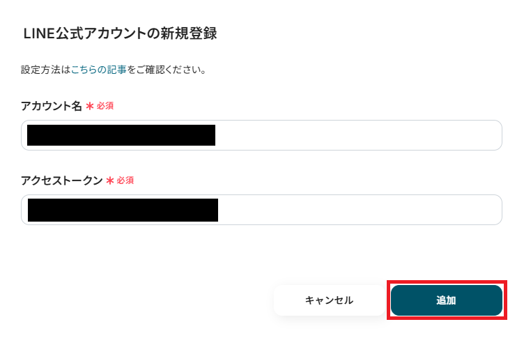 以下の画面が表示されるので、「アカウント名」と「アクセストークン」を入力し追加を押してください。
