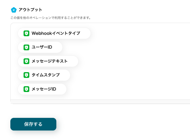 →テストをクリック →成功 アウトプット(取得した値)からチャットの送信内容が取得できました。