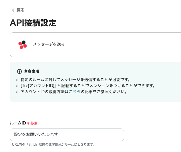 - Chatworkのトリガー設定では、どのルームの投稿を自動化の対象とするか、ルームIDを任意で設定してください。