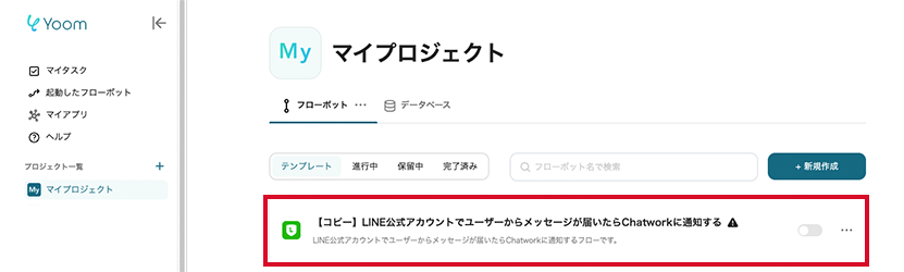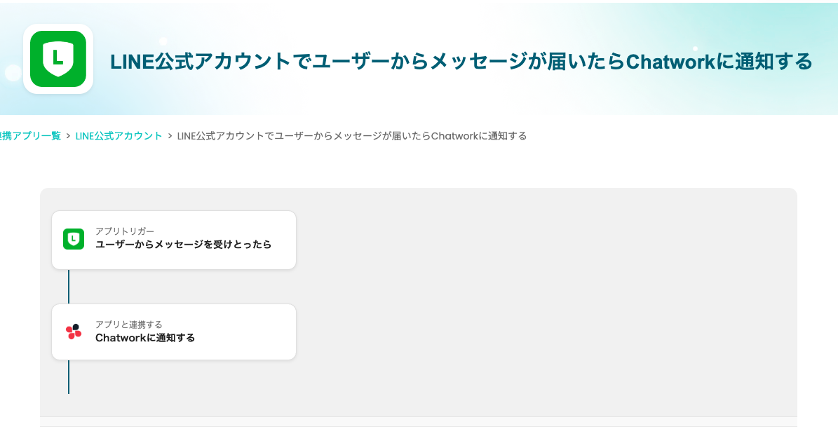 ここからは、LINE公式アカウントでユーザーからメッセージが届いたらChatworkに通知する自動化を、Yoomのテンプレートフローボットを使って解説します。