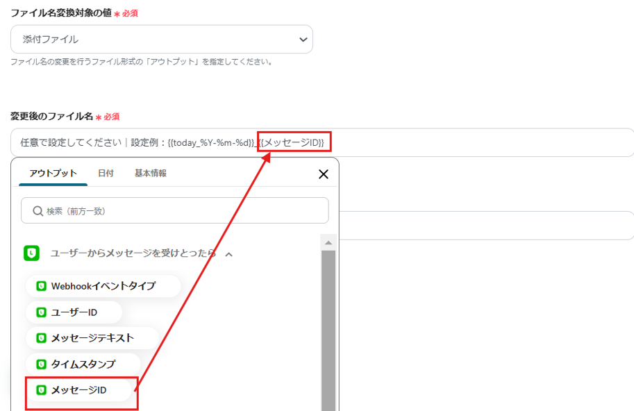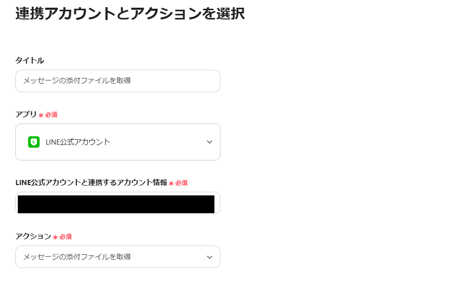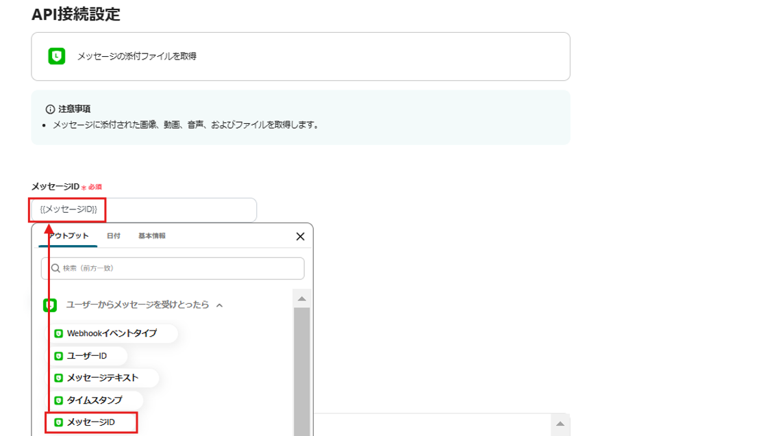 - LINE公式アカウントのアクションでは、ファイルを取得する対象のメッセージIDを任意で指定できます。