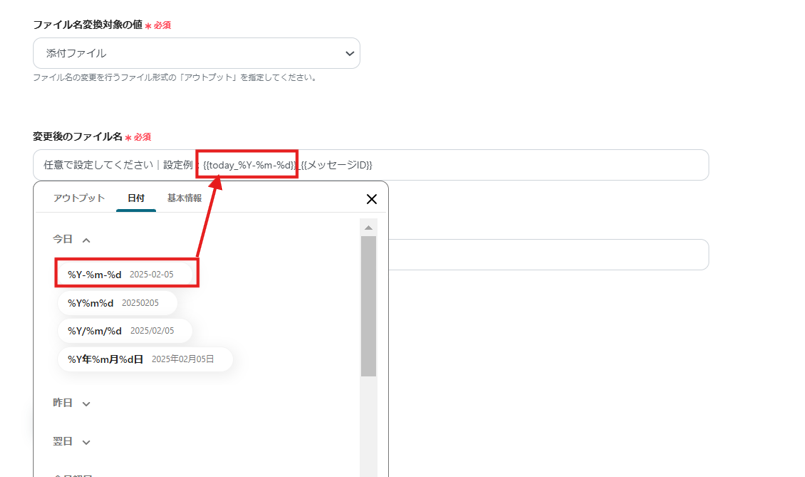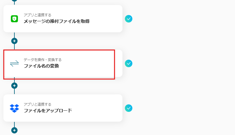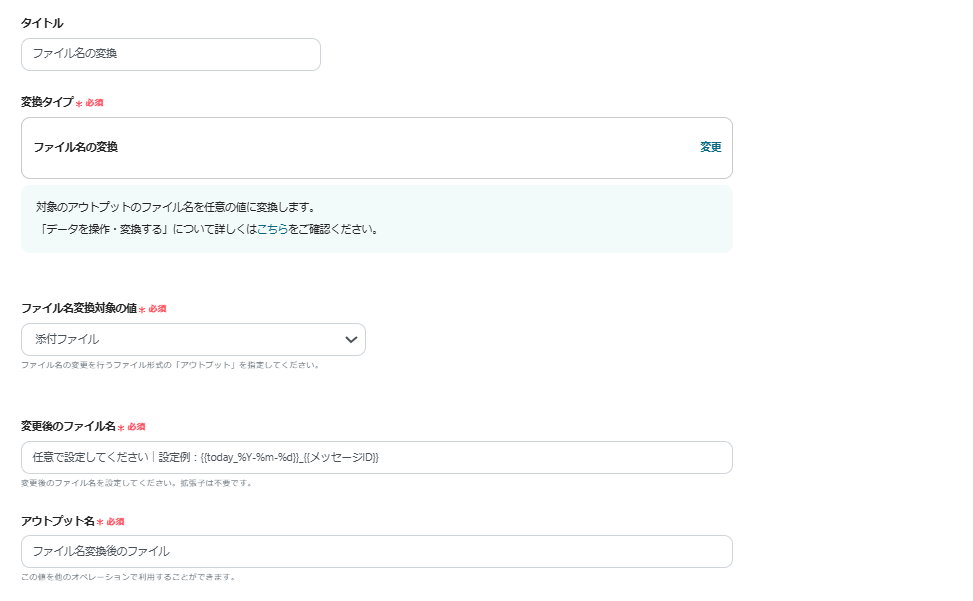 - 必要に応じて、オペレーションでデータ変換機能を使用し、取得したファイルの名前を任意のものに変更します。