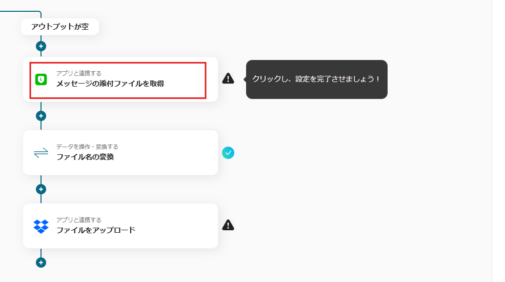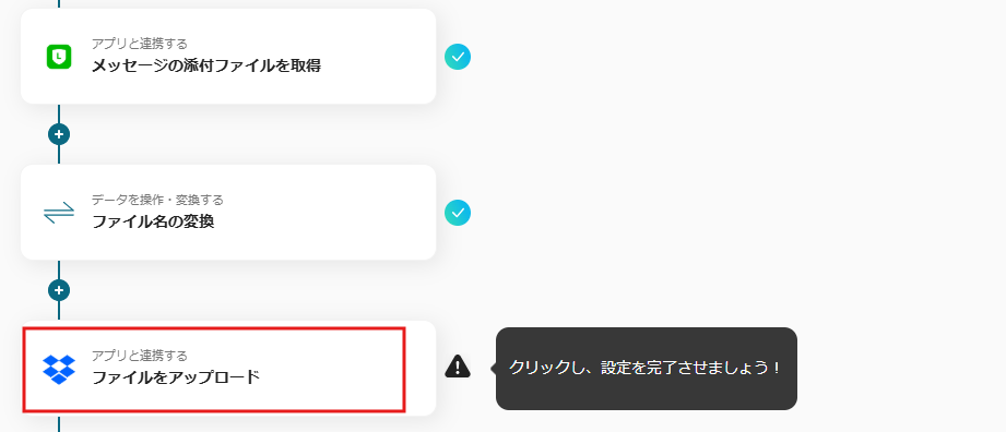 「ファイル名の変換」まで行ったら、+ボタンからアップロード可能な他のアプリを選択し、Dropboxのフローは削除してください。