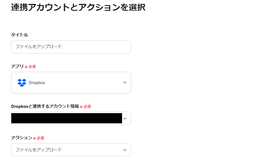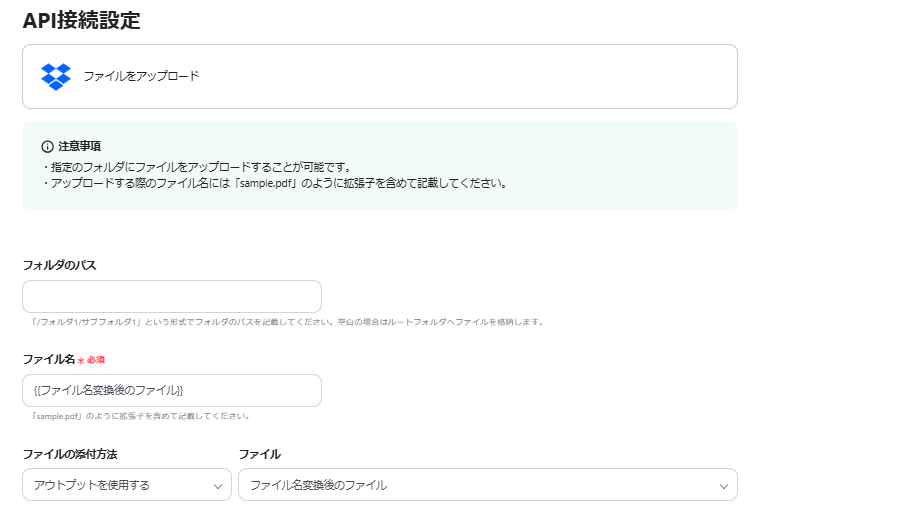 - Dropboxのアクションでは、アップロード先のフォルダパスやファイル名、ファイルの添付方法などを任意で設定できます。
