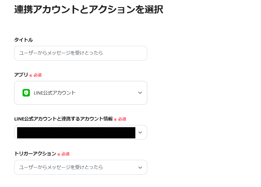- 次に、トリガーでLINE公式アカウントを選択し、「ユーザーからメッセージを受けとったら」というアクションを設定します。
