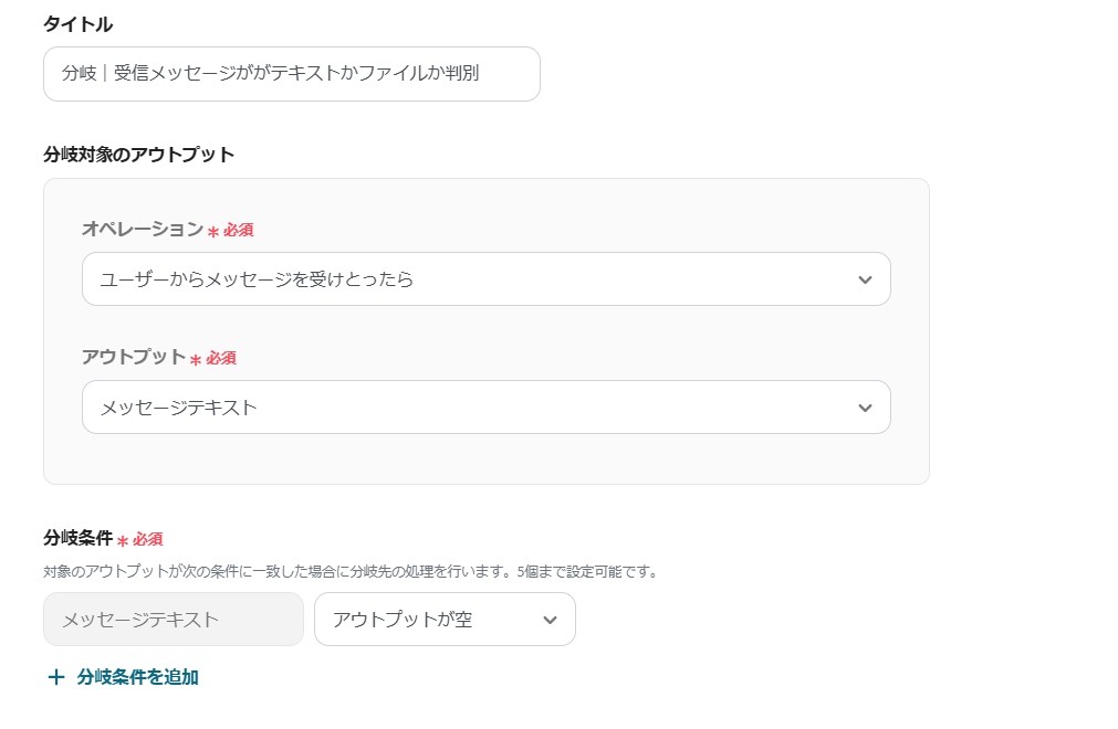 - 分岐機能では、ファイル名に特定のキーワードが含まれる場合や、特定の拡張子を持つファイルの場合など、通知のトリガーとしたい条件を任意で設定してください