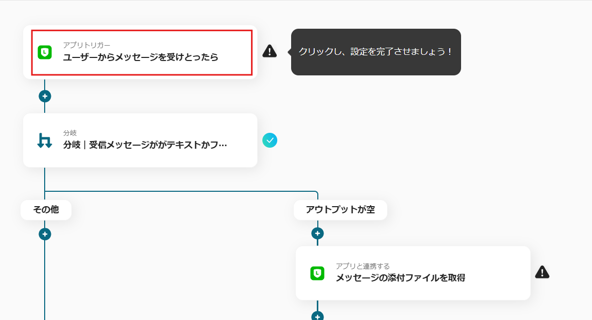 - 次に、オペレーションで分岐機能を設定し、受信したメッセージにファイルが添付されている場合のみ、後続の処理に進むよう設定します。