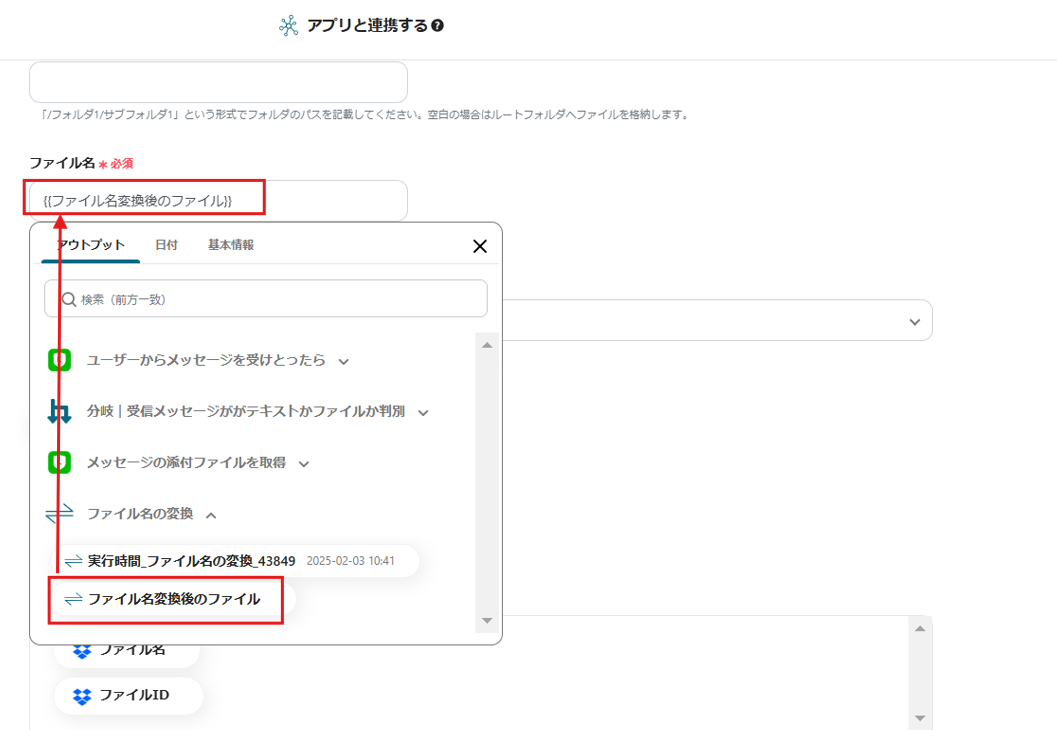 - Dropboxにファイルをアップロードする際、アップロード先のフォルダパスやファイル名を任意で設定できますBoxから取得したファイル名などの情報を変数として利用することも可能です