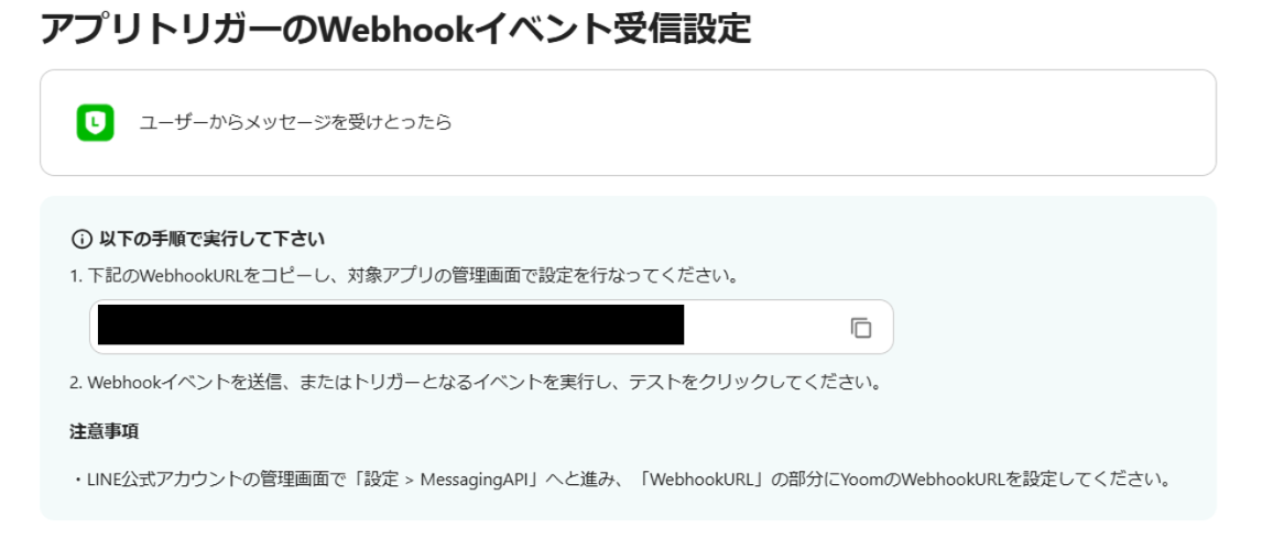 - 次に、トリガーでLINE公式アカウントを選択し、「Webhookイベントを受けとったら」を設定して、メッセージの受信を検知します。