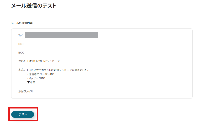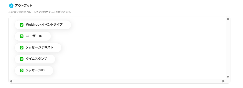 投稿後、Yoomの画面に戻って「テスト」をクリックすると、以下の情報がアウトプットとしてLINE公式アカウントから取得できます。