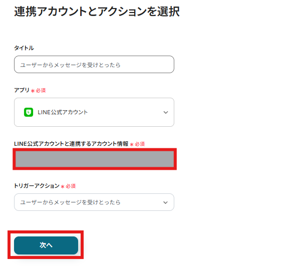 連携アカウントとアクションを選択する画面が表示されるので、今回使用するLINE公式アカウントで間違いないかを確認し、「次へ」をクリックしましょう。