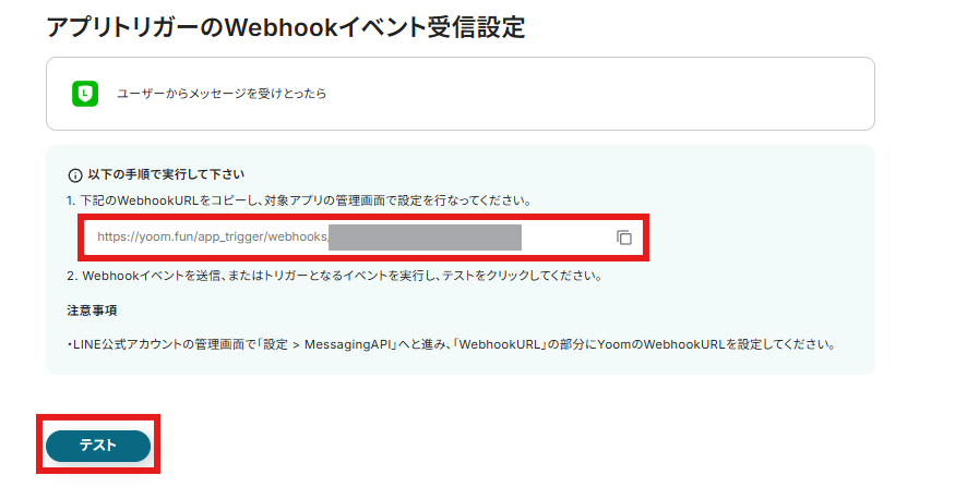 Webhookの設定画面が表示されるので、注意事項の通りにLINE公式アカウントで設定を行いましょう。