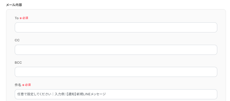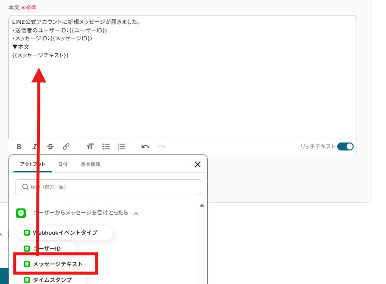 「LINE公式アカウントに新規メッセージが届きました。」など、毎回同じテキストを使用する部分は定型文として固定値で入力します。