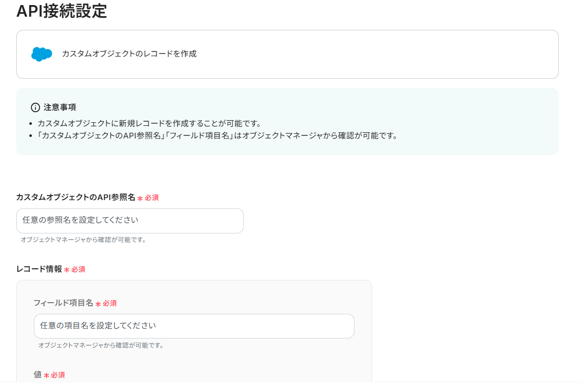 Salesforceにレコードを追加するステップで、「追加するレコードの値」にカスタム項目が表示されます。