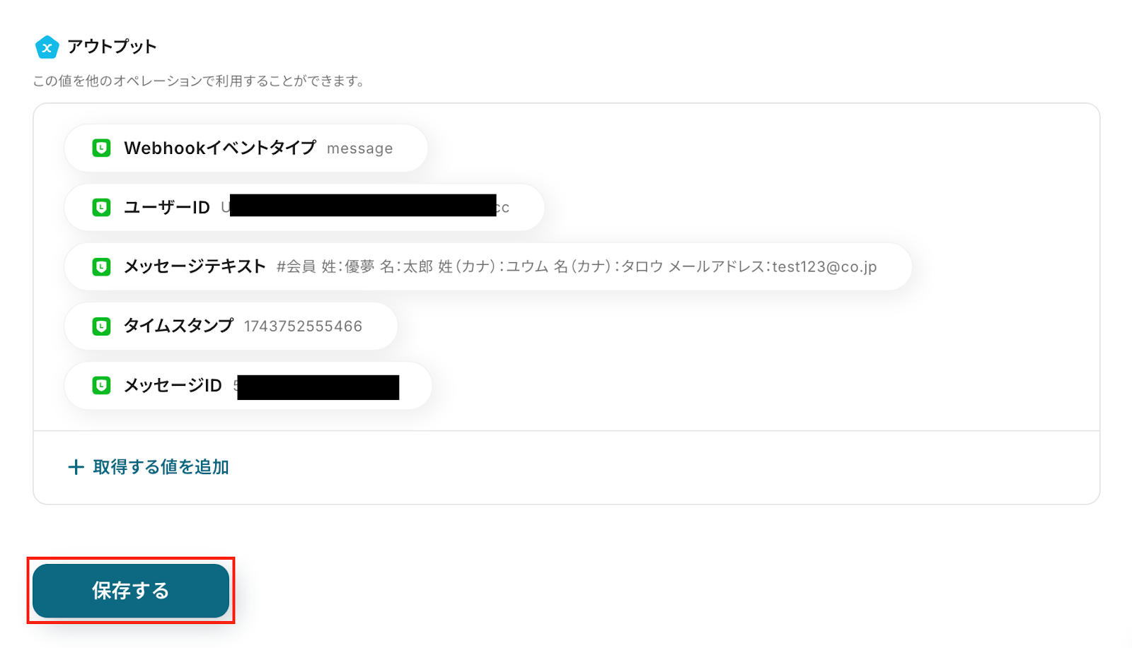アウトプットからチャットの送信内容が取得できたら、「保存する」をクリックしましょう。