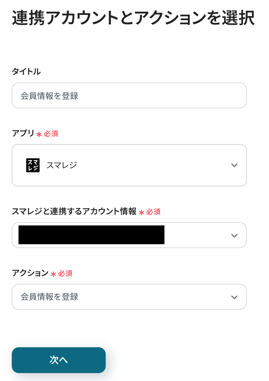 クリックすると以下のような画面に移ります。アカウント情報と書かれた項目にはステップ1でマイアプリ連携した際の情報が記載されています。