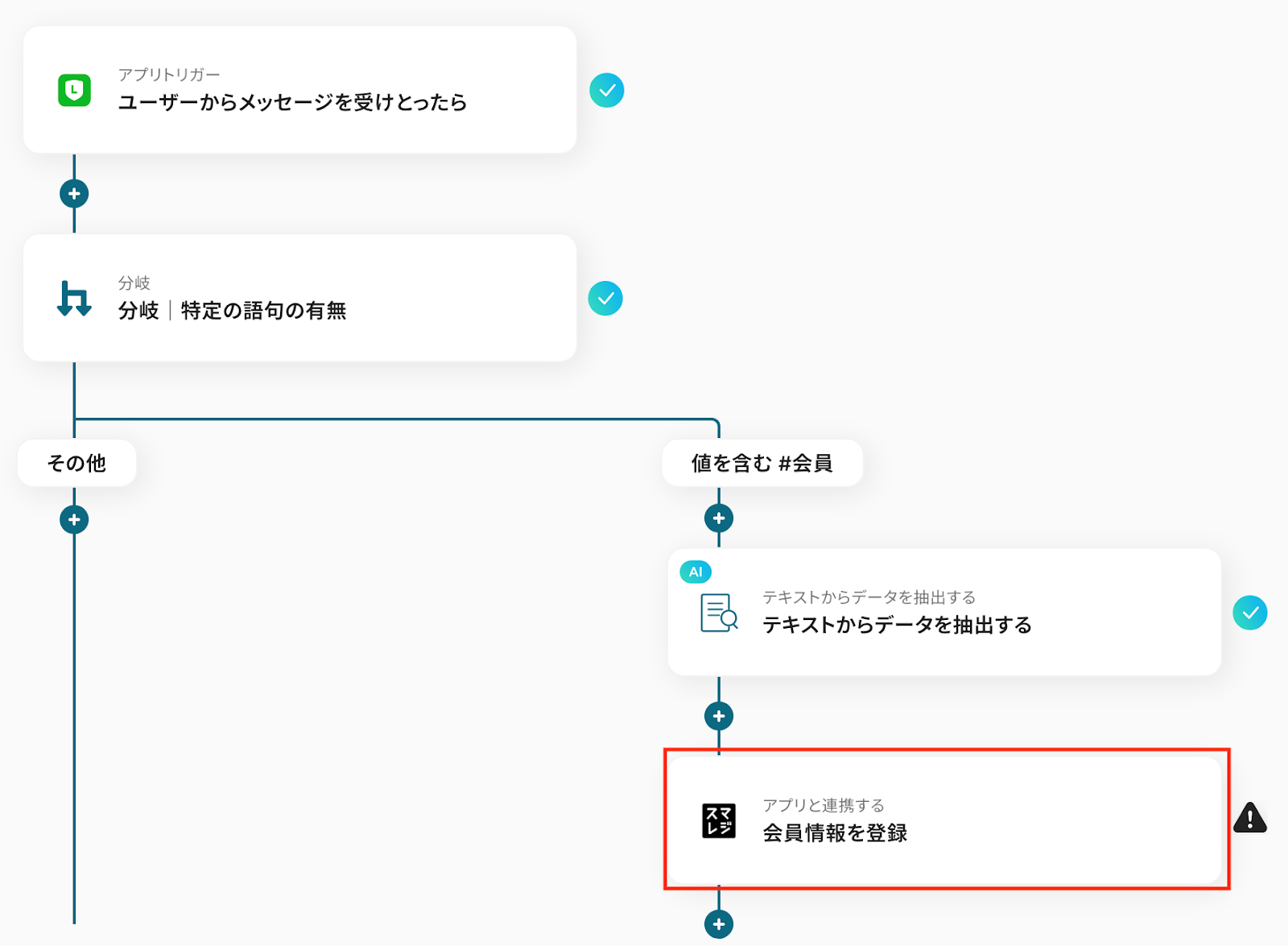 「LINEの特定投稿をもとに、スマレジに会員情報を登録する」フローは、LINEの特定のメッセージをもとにスマレジに会員情報を自動登録する業務ワークフローです。