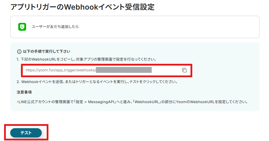 設定後LINE公式アカウントで友達追加をしてから「テスト」をクリックします。