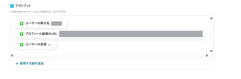 アウトプットはステップ3で行った操作で、連携したLINE公式アカウントから取得した値です。