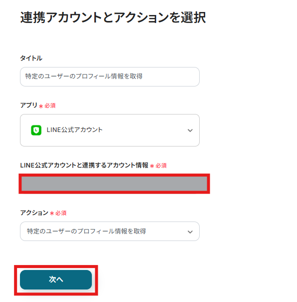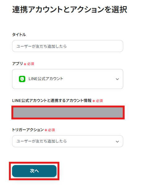 連携アカウントとアクションを選択する画面が表示されるので、先ほどと同様にLINE公式アカウントのアカウントを確認し「次へ」をクリックしましょう。