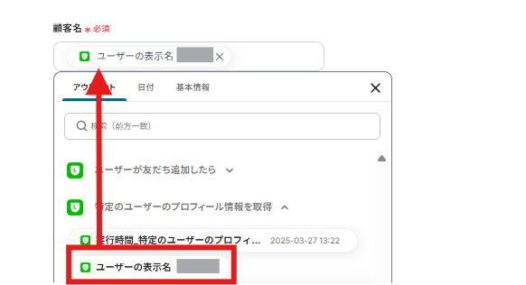 API接続設定が表示されるので顧客名の箇所をクリックし、アウトプットから「ユーザーの表示名」をクリックします。