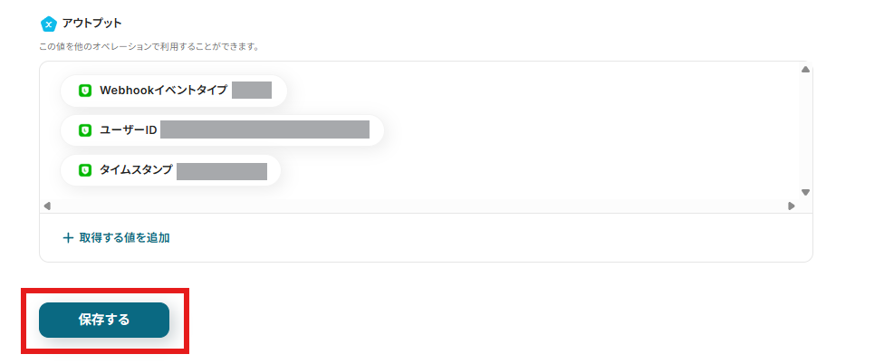 この値に関しても後の操作で入力に使用できます。テスト成功確認後「保存する」をクリックしましょう。
