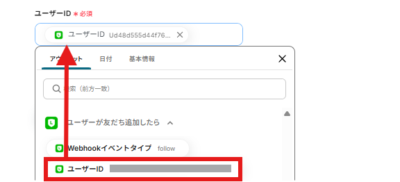 ユーザーIDの項目をクリックし、下に表示されるアウトプットより「ユーザーID」を選択し入力しましょう。