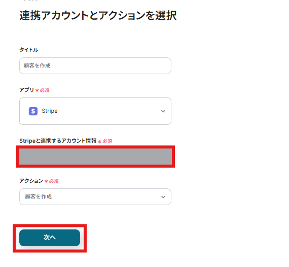 連携アカウントとアクションを選択する画面では、今回連携するStripeのアカウントで間違いないかを確認し「次へ」をクリックしましょう。