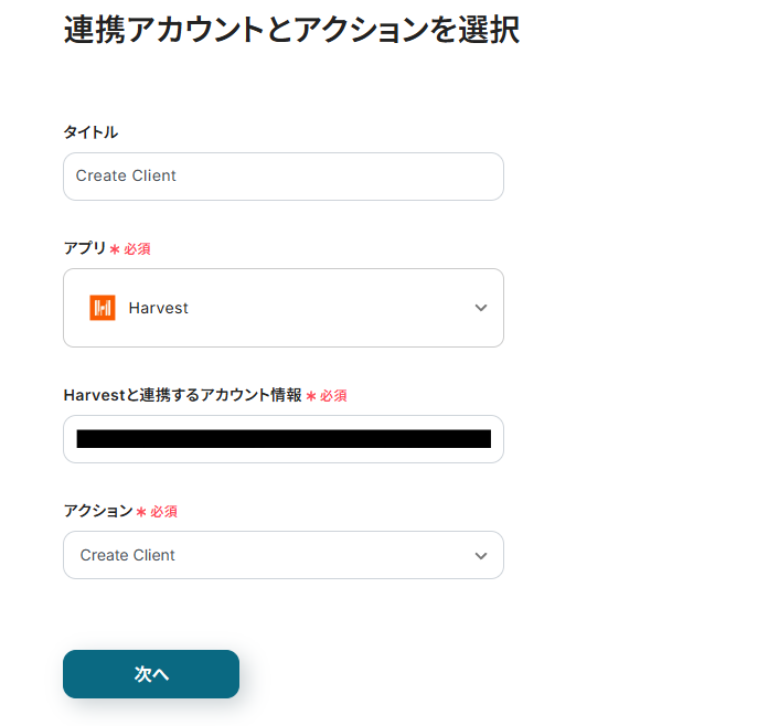 連携アカウントとアクションを選択する画面が表示されるので、今回連携するHarvestのアカウントを確認し「次へ」をクリックします。