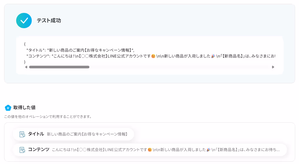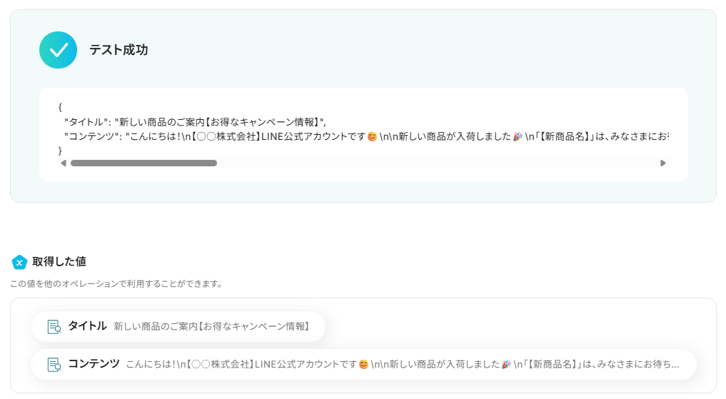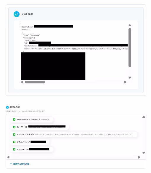 設定ができたらYoomに戻り「テスト」をクリックします。以下の画面のように取得した値にメッセージの内容が表示されます。