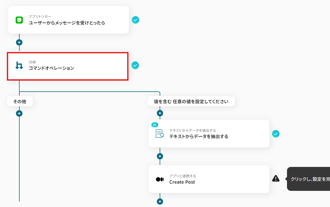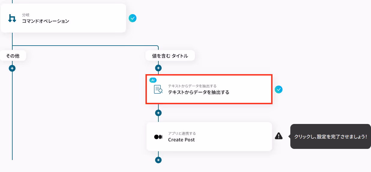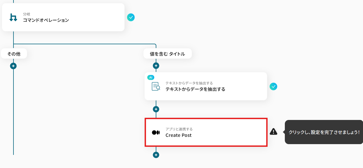 今回は「タイトル」と含む場合に、次のフローへ進むよう設定しました。もちろん任意で変更が可能なため、運用に合わせて設定してください。