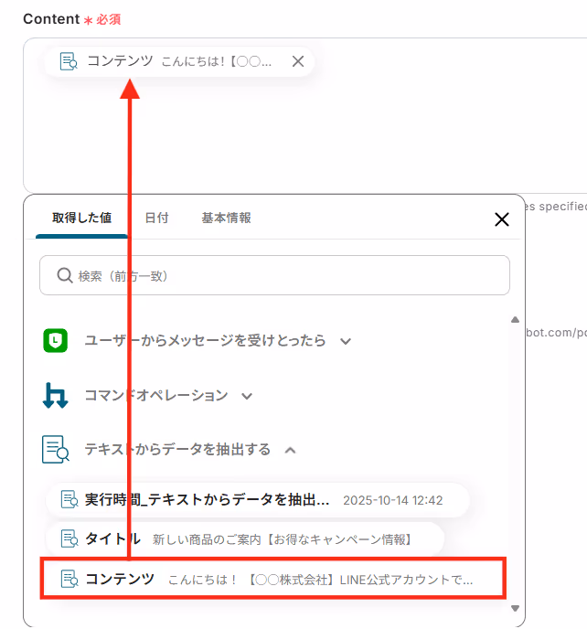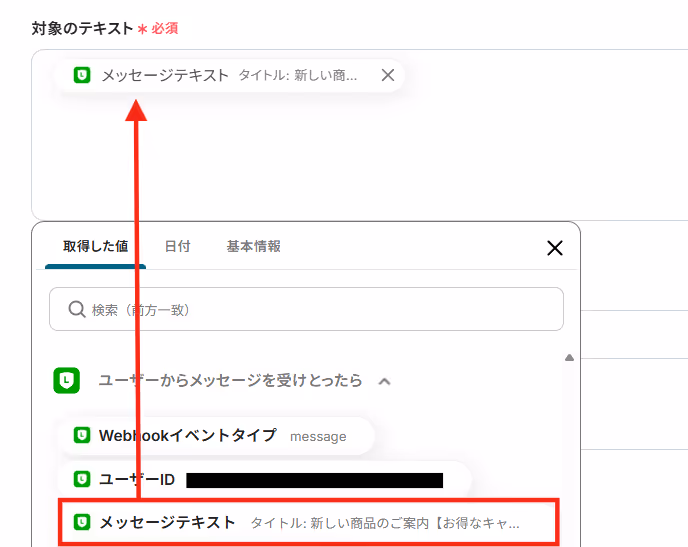 対象のテキストには以下のようにLINE公式アカウントから取得した値を用いて「メッセージテキスト」を入力します。
