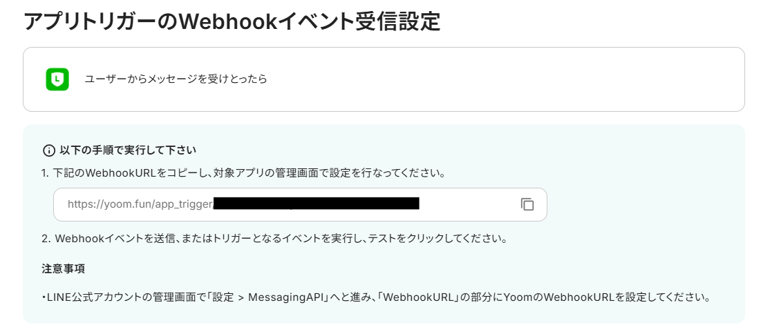 以下のように設定が必要なWebhookURLが表示されるため、LINE公式アカウントでWebhookを設定しましょう。