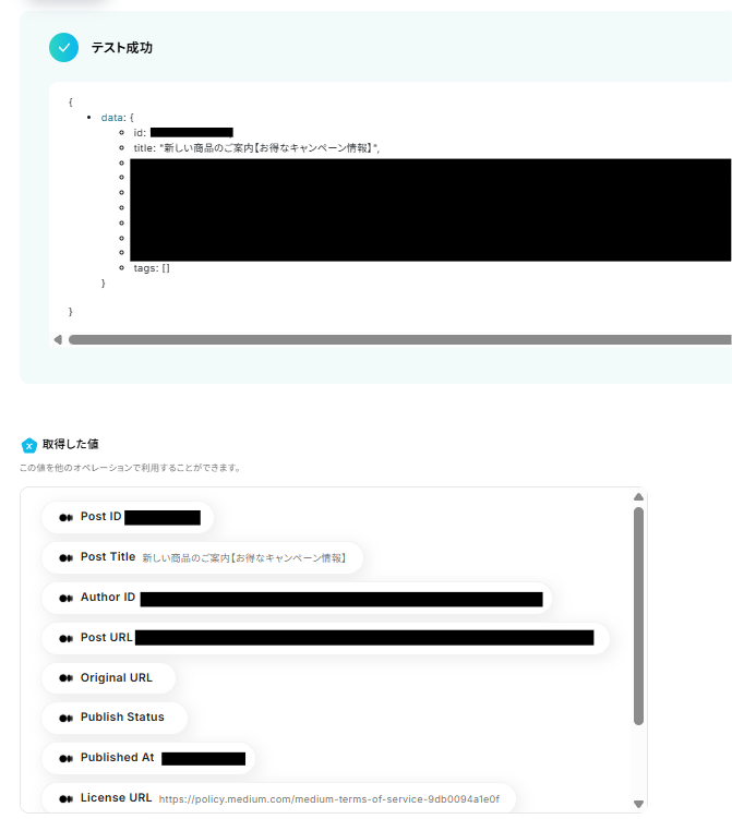 この後、この取得した値の内容をフローの設定に活用することで、LINE公式アカウントのデータをMediumへ連携可能です。